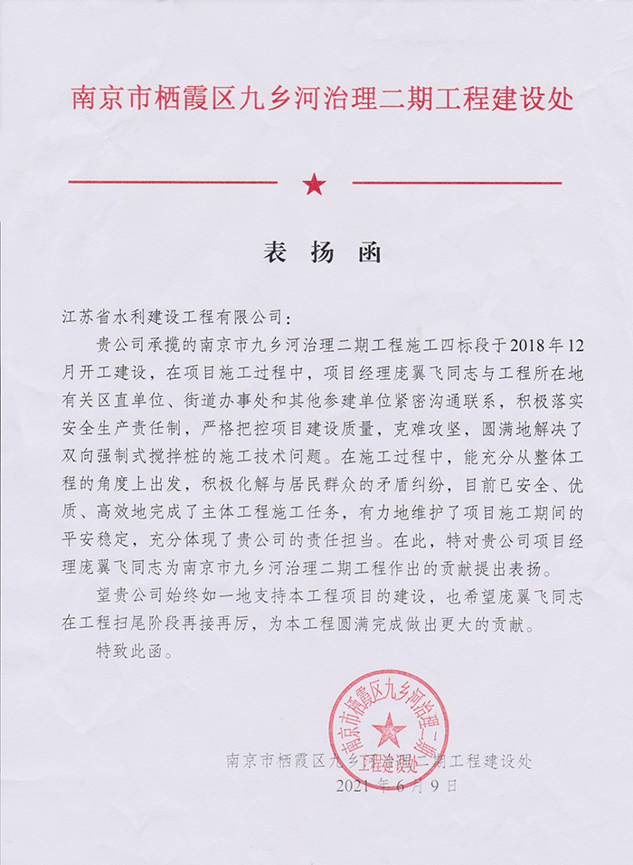 6月9日,南京市棲霞區(qū)九鄉(xiāng)河治理二期工程建設處發(fā)來《表揚函》,對我公司承建的南京市九鄉(xiāng)河治理二期工程施工四標段工程圓滿解決施工技術難題、高效完成主體工程施工任務給予高度評價,表揚了項目經(jīng)理龐翼飛同志及項目團隊做出的貢獻。