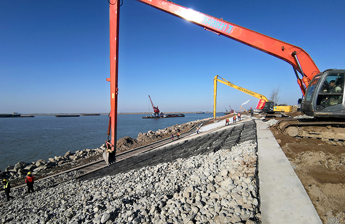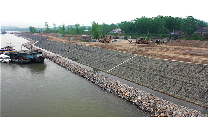 至2021年7月2日,隨著最后一斗塊石拋投入水,工程合同內(nèi)工程量全部優(yōu)質(zhì)、高效、安全完成。工程累計完成水下散拋石21萬方,賽克格賓石籠1.5萬方,澆筑砼6600方,雷諾護墊護坡3500米,鉸鏈排7.2萬平方,生態(tài)放養(yǎng)魚苗1080萬尾。