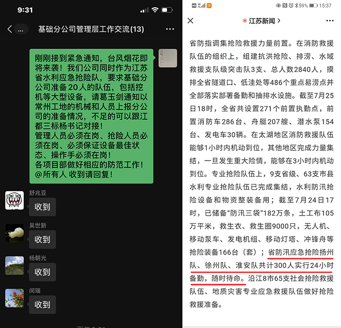 23日晚8時(shí),公司接到省應(yīng)急管理廳要求防汛搶險(xiǎn)隊(duì)伍集結(jié)待命的通知。公司綜合管理部門立即匯報(bào)總指揮,在應(yīng)急搶險(xiǎn)隊(duì)工作群內(nèi)發(fā)布集結(jié)信息。蘇南片區(qū)各分公司在建項(xiàng)目部立即行動(dòng)起來,紛紛報(bào)名請(qǐng)戰(zhàn)。